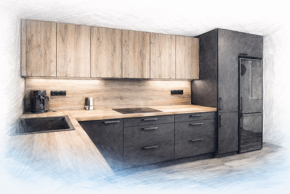 Ať už plánujete kompletní rekonstrukci, nebo jen menší úpravu, díky našemu návrhu uvidíte svou novou kuchyň nebo koupelnu dřív, než vznikne – přesně, technicky i vizuálně