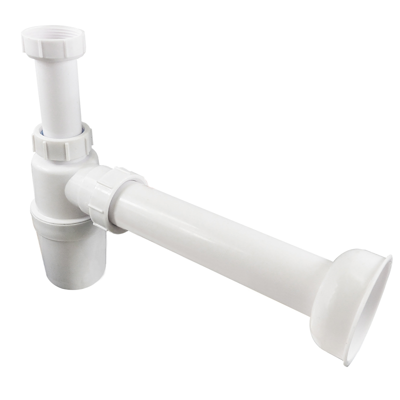 Dřezový sifon pro optimální připojení na stěnu a k umyvadlu, s pryžovým těsněním. Součástí je odpadní trubka o průměru 40 mm.