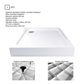 Dno vaničky je zpevněno žebrováním a nosnost vaničky je 250 kg. Vanička je dodávána spolu s nožičkami a sifonem.
