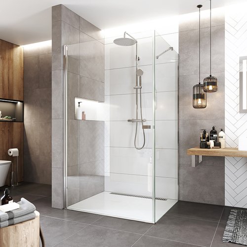 Stylové řešení do prostornějších koupelen, které zaujme elegantní osou otáčení a umožní široký vstup bez rámů.