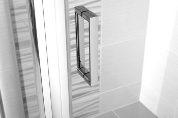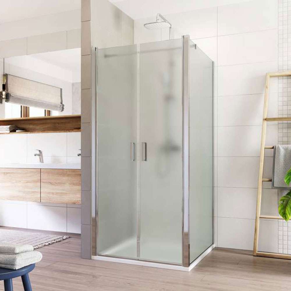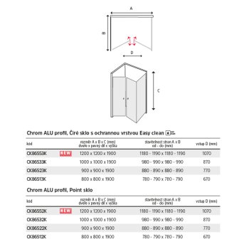 Hliníkové profily v barvě chrom, lítací dveře a pevný díl, sklo Point, síla skla 6 mm, čtverec, 1000 (dveře) x 1000 (pevný díl), výška 1900 mm. Více