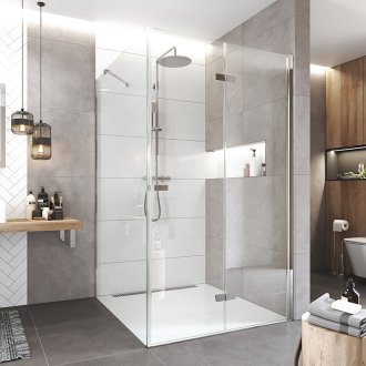 Dveře otevírané dovnitř nebo ven, s možností zalomení křídla na polovinu, umožňují maximální šíři vstupu i v menších prostorech a pohodlný vstup do sprchového prostoru.